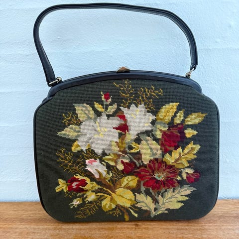 En vintage håndtaske med et leopardmønster nederst og broderet grøn stof øverst. Tasken har en detaljeret perlehåndtag og en dekorativ blomst på klappen. Indersiden af klappen har et leopardmønster og lukker med en trykknap. Måler 34x36 cm. Tags: taske, leopard, vintage, håndtaske.
