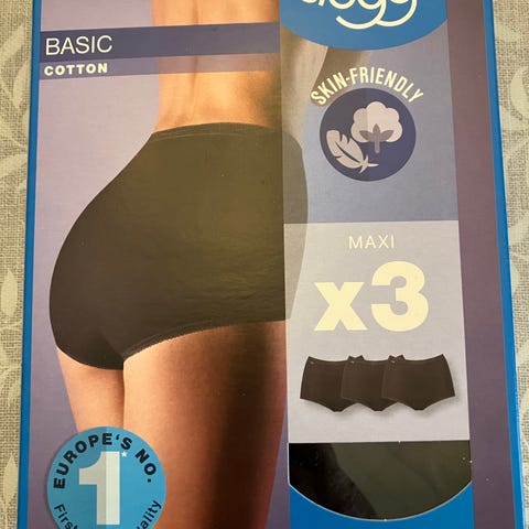 En pakke med Sloggi Luxe Maxi trusser i størrelse 44. Materialet består af 85% bomuld, 10% elastan, og 5% polyamid. Trusserne er hvide med blonde detaljer. Original emballage er med.