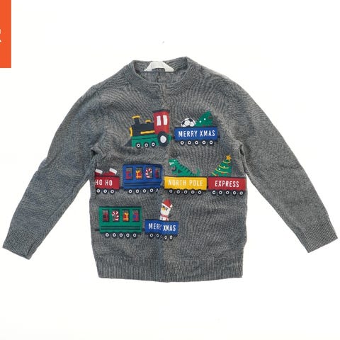 En grå julesweater med lange ærmer. Forsiden viser et togtema med teksten 'Merry Xmas', 'North Pole', 'Express' og 'Ho Ho'. Sweateren har ribkanter ved hals, bund og ærmer.