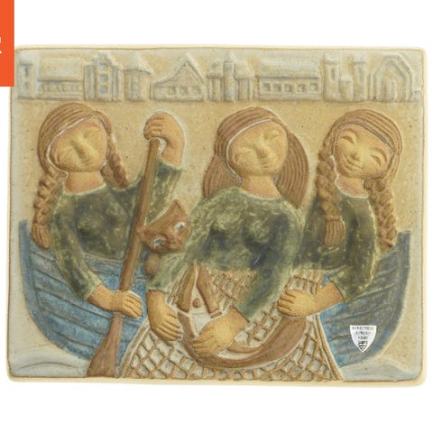 Dette er et farverigt relief kunstværk med en struktureret overflade, som måler 34x23 cm. Forsiden har en abstrakt design med en blanding af farver, herunder gul, turkis, rød og brun. Bagsiden er ensfarvet sort med initialerne 'HJ'. Det er sandsynligvis fremstillet af et tungt material, muligvis keramik eller gips.