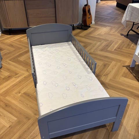 Basson juniorseng i hvid. 70x160 Sengen har sengehest i den ene side og høje gavle i hoved- og fodende. Velegnet som overgangsseng fra tremmeseng til almindelig seng for mindre børn. Klassisk design, der passer ind på de fleste børneværelser. Der er slidt maling af på den høje sengegavl men kan nemt males over. Incl . Traumeland madres 70x160