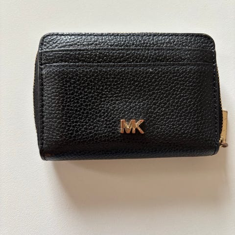Jeg har til salg en pung i sort, glat læder af mærket Michael Kors. Pungen har rum til kort og kontanter. Pungen åbnes med tryklås, hvor der er fem rum til kort. Bag på pungen er en stor lomme med lynlås, som er delt i to rum. Her kan man have sedler og mønter. På billederne kan man se pungen åben til kort og og man kan se lynlåslommen åben. Pungen er brugt, og har ingen fejl, mangler eller slid.