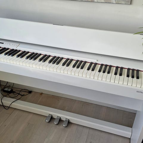 Digitalt klaver keyboard i fuld størrelse med tangenter i klassisk sort og hvid. Medfølgende stativ i metal, der kan justeres i højden. Egnet til hjemmebrug, øvning og undervisning. Tilslutninger og betjeningsknapper er placeret over tangenterne for nem adgang under spil.