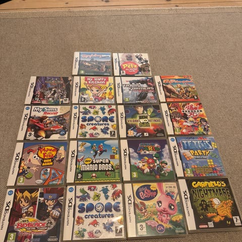 Nintendo DS håndholdt spillekonsol med oplader og flere Nintendo DS spil. Konsollen har dobbelt skærm og betjenes med knapper og touchskærm. Egnet til håndholdt spil og brug af Nintendo DS spilpatroner. Leveres med strømforsyning/oplader samt et udvalg af Nintendo DS spil i æsker, som kan ses på billederne.