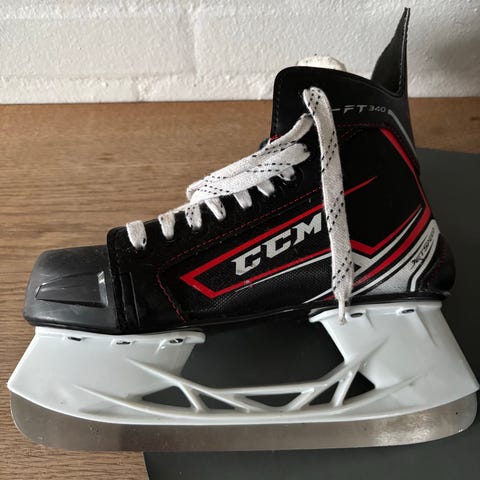 CCM ishockey skøjter i børnestørrelse EU 34. Skøjterne er primært sorte med røde og pink detaljer. De er designet til ishockeybrug og har snørelukning for god tilpasning om foden. Velegnet til børn med skostørrelse 34, der skal bruge skøjter til isaktiviteter eller ishockeytræning.