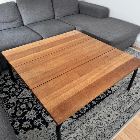 Bordet er et par pt gammelt, og derfor har bordpladen også spor af oliepletter og lidt tusch fra et barn. Bordet kan slibes og behandles, så det bliver flot igen.