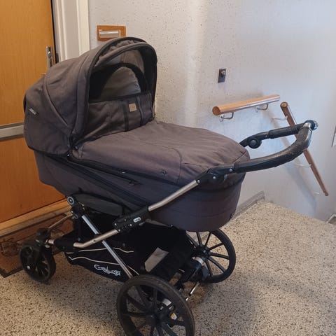 Fin og velholdt emmaljunga barnevogn. Vognen har punkterfri dæk og aluminiums letvægtsstel. Der medfølger madras og sele.