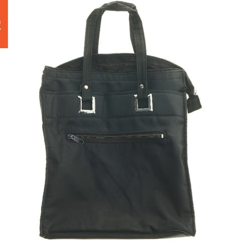 En sort taske med guldfarvede nitter og en justerbar rem. Tasken har et forstykke med en klap og en lynlåslukning hele vejen rundt. Tasken måler 21x12 cm.