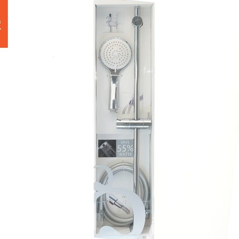 Dette er et brusesæt fra Adora, komplet med en håndbruser, stang og slange. Sættet er designet til at reducere vandforbruget med op til 55%. Det kommer i sin originale emballage og har instruktioner på bagsiden af pakningen.