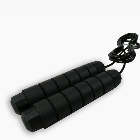 Dette er et sjippetov med grå reb og håndtag lavet af træ. Rebet kan bruges til motion og leg og har metalbeslag, der forbinder håndtagene til rebet. Håndtagene har en ergonomisk form for et komfortabelt greb under brug.