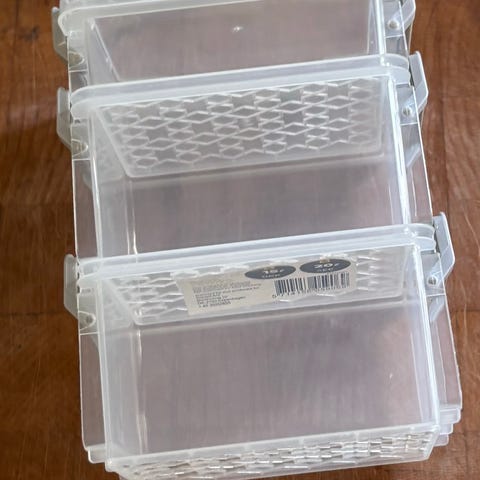 Denne opbevaringsboks indeholder et sæt farverige print rørperler, organiseret i et plastbeholder med låg. Beholderen har flere rum, hver fyldt med forskellige farver perler, som kan bruges til kreative projekter. Boksen måler 40x35 cm.