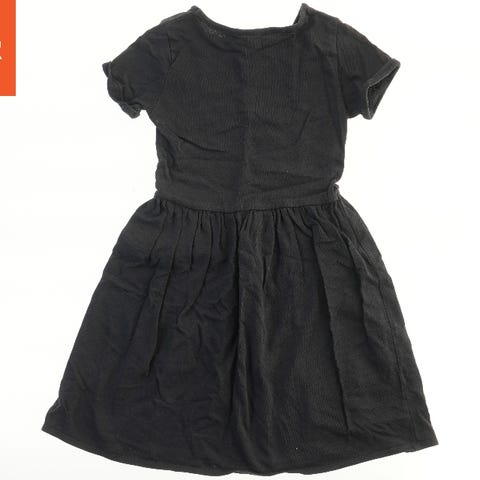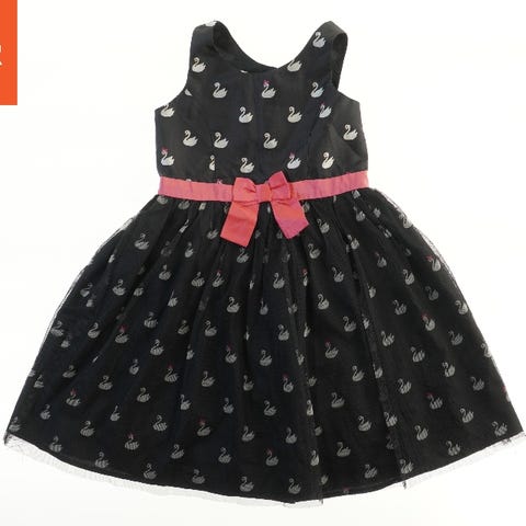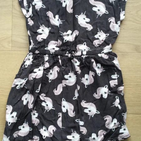 Mørkeblå pigekjole uden ærmer med hvide kanter og et print med teksten 'UNICORN LEAGUE' samt et motiv af en enhjørning på fronten. Kjolen har en linning i hvid, der adskiller toppen fra den nederste del af kjolen, som har fine folder.