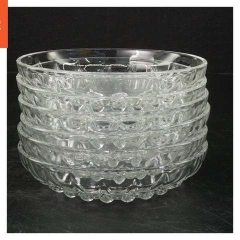 Fire små glas skåle, hver med en diameter på 8,5 cm og en højde på 5 cm. Glassene er klare og har en rund form, velegnet til servering af små portioner eller som dekoration.
