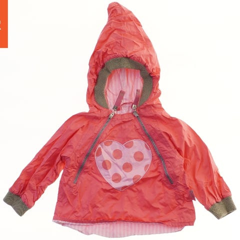 En lyserød jakke med små blomsterprint, der har en hætte og lange ærmer. Jakken har en lomme med en guldknap og en hvid hjerte-formet vedhæng foran.