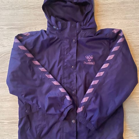 En regnjakke i lilla farve med hætte og et karakteristisk mønster på ærmerne i røde og lilla cirkler. Jakken har en lomme på forsiden og refleksbånd på det ene ærme for øget synlighed. Den kan lukkes ved hjælp af en lynlås.