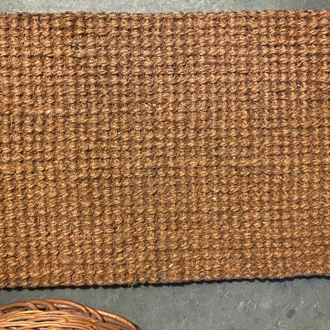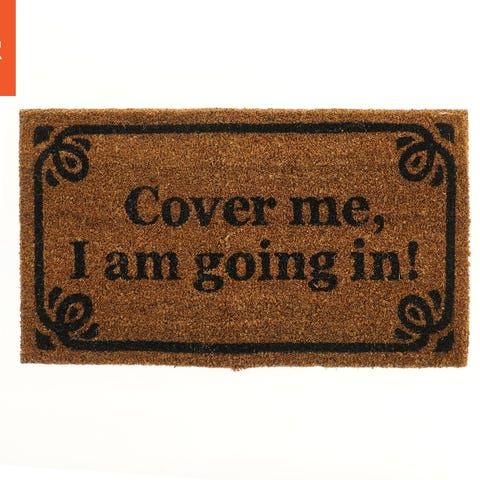 En rektangulær dørmåtte med målene 40x70 cm. Måtten er primært brun med sort tekst på, der lyder: 'WARNING Here lives a desperate house wife'. Den har en ramme omkring teksten. Måtten er lavet af kokosfiber, der er kendt for sin slidstyrke og evne til at fjerne snavs fra sko.