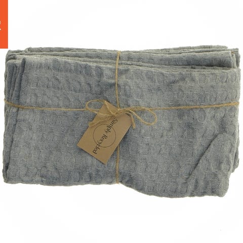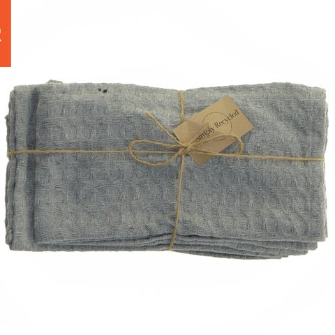 Pakke med to stykker tekstil, sandsynligvis køkkenhåndklæder, i en grå farve. De er bundet sammen med en snor, og mærket med 'Simply Recycled', hvilket antyder at stoffet er genbrugsmateriale. Størrelsen på hver er 70 x 53 cm.