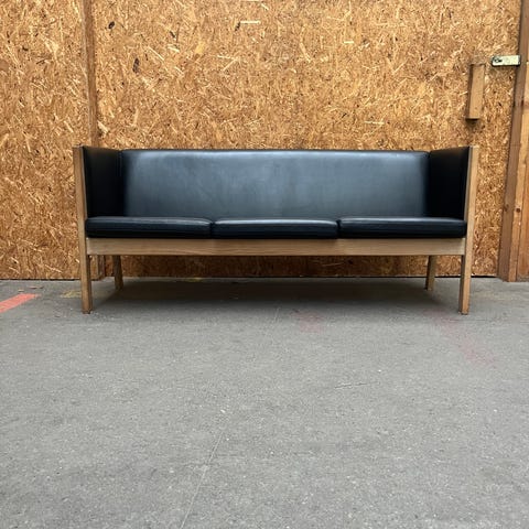 Massiv egetræssofa med mørke cognac farvede læderhynder.