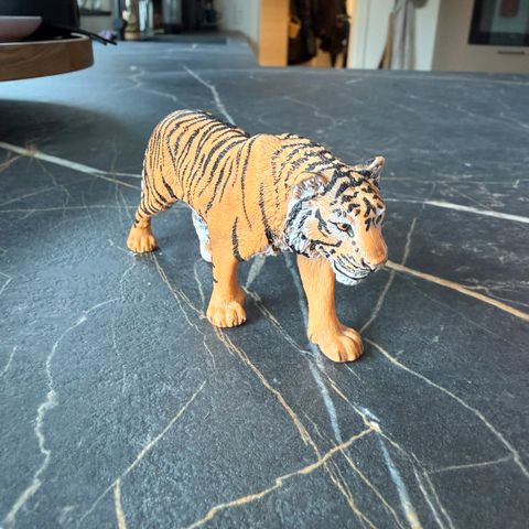 Dette er en lille tigerfigur lavet af plast. Figuren er 7 cm lang og viser en tiger i en stående position med realistiske tigerstriber og detaljerede ansigtstræk. Den er ideel som samleobjekt eller til brug i dyretemaspil.