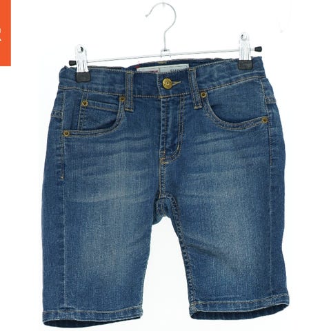 Et par denim shorts fra mærket Levi's. De er i en blå farve med lys vask. Shortsene har lommer foran og bagpå, samt et knaplukning og bæltestropper. De har en klassisk jeansstruktur.