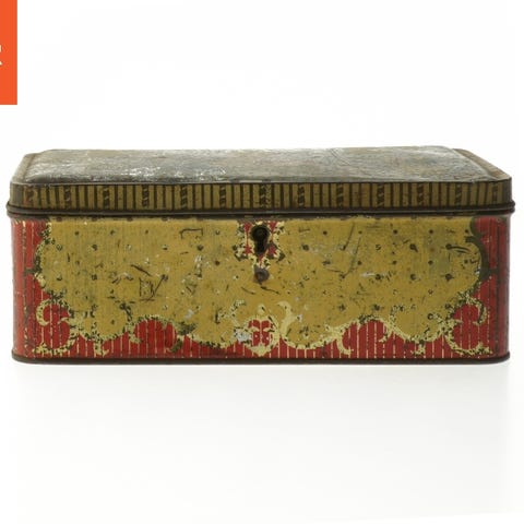 En rektangulær metalæske designet til at ligne en bog. Æsken har en størrelse på 12x10 cm og har en simpel låsemekanisme på forsiden. Overfladen virker plan, men viser små tegn på patina og brug. Ingen yderlige dekorationer eller branding synlige.