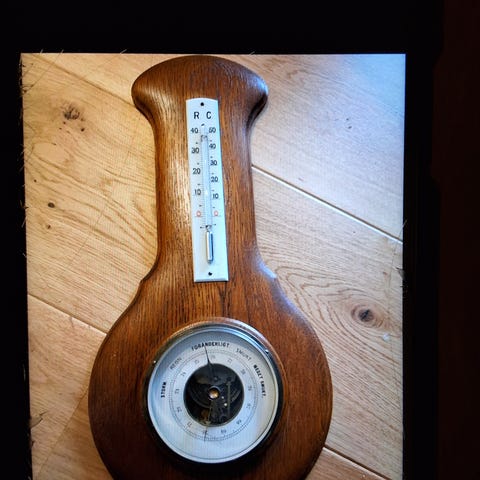 Dette er et klassisk vægbarometer kombineret med et termometer, monteret på en elegant træramme. Barometeret har en traditionel analog urskive, mens termometeret har en vertikal glasrørskala, der viser temperaturen. Barometeret og termometeret er sat i gyldne metalkapper. Det hele giver et retro og funktionelt udseende, ideelt til vintage eller klassisk indretning. Vægbarometeret er 38 cm langt og kan nemt hænges op på en væg.