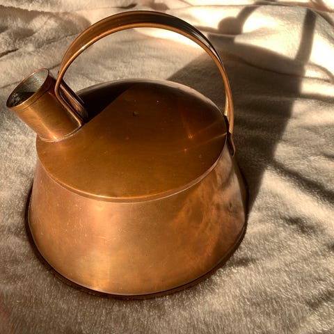 Kedel m. tud, Kobber, Kobberkedel 1 1/2 L. med hank låg og tud . Stempel i hank . Rigtig flot uden skader . Ingen misfarvninger ,det er lys fra lampe der snyder! Nu nedsat !!