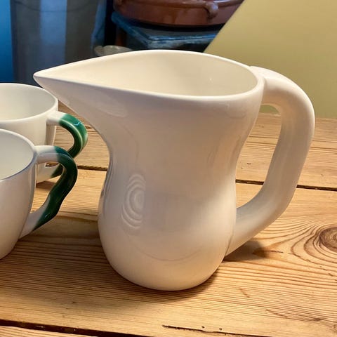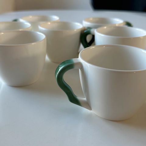 Ursula, Royal Copenhagen kopper og tallerkener i hvidt fajance, med grøn hank på kopperne, designet af nyligt afdøde Ursula Munch Petersen. Sættet består af flere kopper og ovale tallerkener i ensfarvet hvid. Der er små brugsspor, så som almindelige krakeleringer fra fajancen på tallerkner og minimale misfarvninger på et par af kopperne. Jeg har forsøgt at tage billeder af det. Pris pr stk kop= 650kr og pr stk tallerken/underkop=200kr. Kom gerne med et samlet bud.