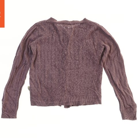 En strikket cardigan i mørkegrå. Den har en v-udskæring og tre knapper foran. Cardiganen har lange ærmer og to små lommer foran. Strikmønsteret er åbent og netlignende. Etiketten viser mærket Maison Louis.