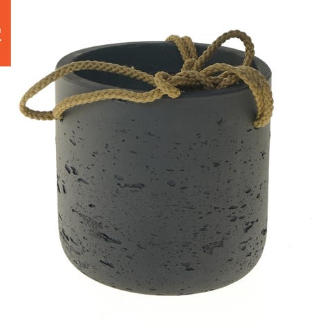 Denne genstand er en rund potte med en diameter på 15 cm. Den er sort og har en grov, rustik overflade. Potten har flere snore fastgjort, som kan bruges til ophæng eller dekoration. Potten er formodentlig lavet af keramisk materiale og er egnet til dekoration eller plantebrug i hjemmet.