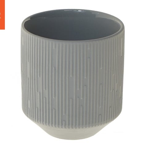 Den viste vase er grå og har en struktureret yderside med lodrette linjer. Den er rund med en diameter på 9 cm og en højde på 10 cm. Vasen er glat indvendig, hvilket gør den velegnet til små blomsterarrangementer. På undersiden er der et logo, der angiver mærket House of Sander.