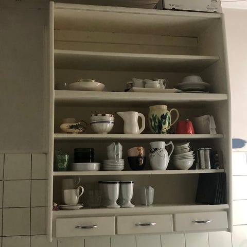 Ældre originalt køkkenskab med glaslåger, hylder og skuffer.