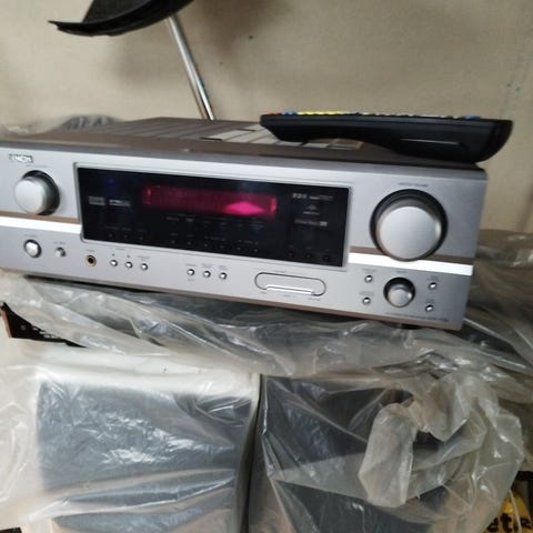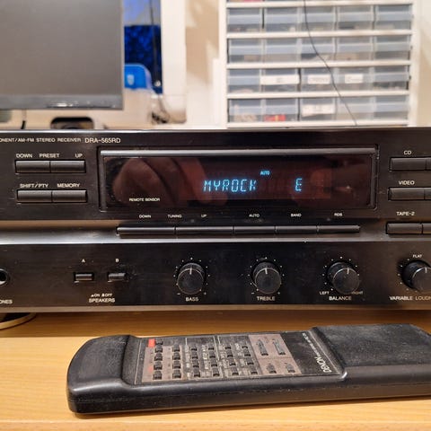 Denon forstærker i sort. Enheden har flere ind- og udgange på bagsiden til tilslutning af forskellige lydkilder og højttalere. Fronten har betjeningsknapper til lydstyrke, balance og tonekontrol samt hovedtelefonudgang.