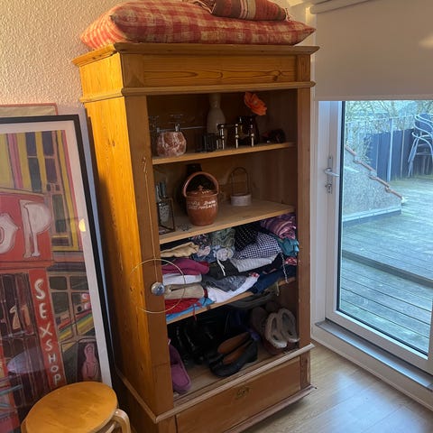 Gammelt karlekammerskab formentlig i fyr, i fin stand, med bøjlerække i skabet samt 2 skuffer for neden.