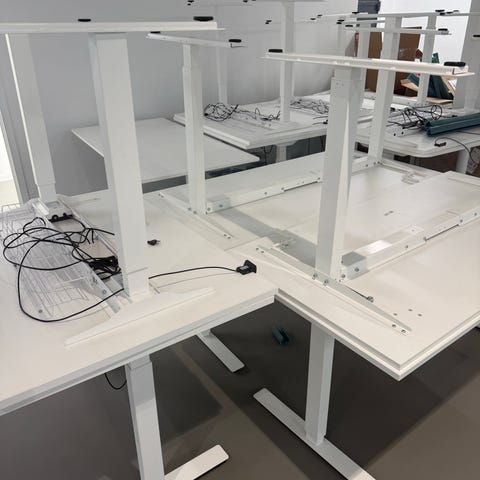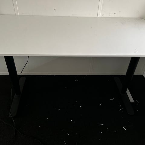 Jeg har 11 x IKEA Hæve-sænkebord skriveborde i lys grå overflade med hvidt stel. Bordet har rektangulær bordplade og manuel hæve/sænke funktion. Egnet som arbejdsbord på kontor eller hjemmekontor.