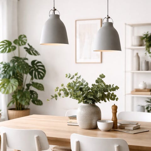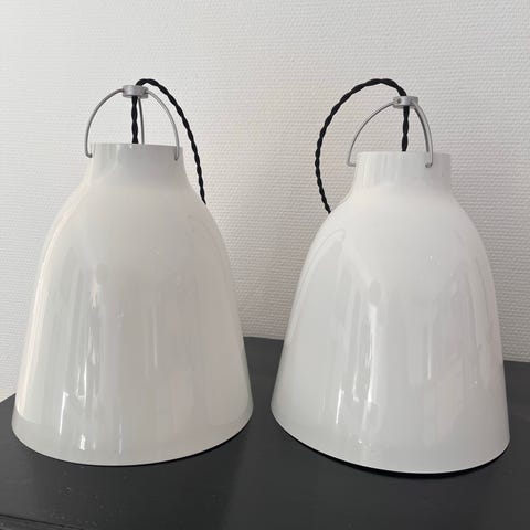 4 stk Fritz Hansen pendler i hvid. Brugt som belysning over køkkenbord. Højde 20,5cm , diameter 16,5cm. Ledning (grå) medfølger. Sælges samlet for 2600kr