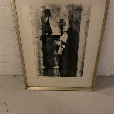 Ukendt kunstner, signeret litografi nr 120/200, måler 100 x 140, Abstrakt med figurative og mytiske Douce farver. Litografi er indrammet i glas i en sølvramme og egner sig til ophæng i stue, kontor eller gang som dekorativ vægkunst.
