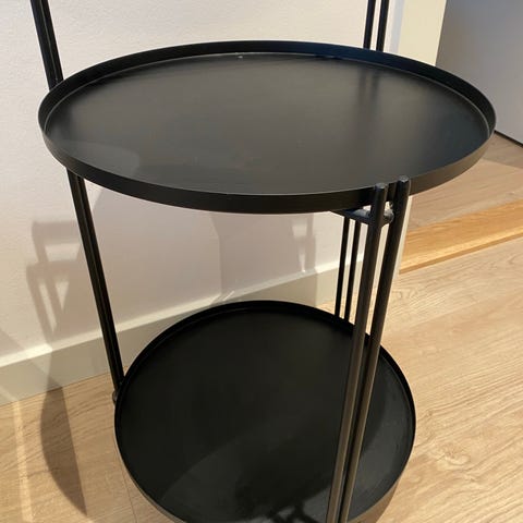 Sort jern stativ. Pladerne er lamineret tror jeg det hedder. Marmorlignende