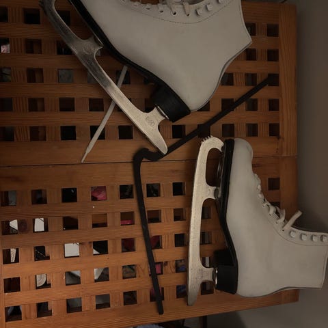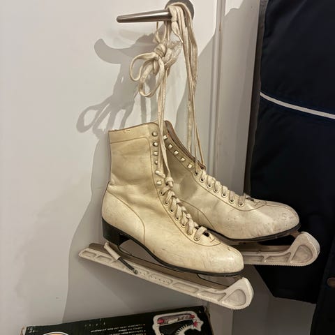 Story kunstskøjter i størrelse 39 i hvid farve. Klassisk model med snørelukning og høj ankelstøtte. Skøjterne har blanke stålklinger og medfølgende klinge-beskyttere. Egnet til kunstskøjteløb eller fritidsskøjteløb på is.