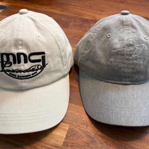 Mads Nørgaard kasket i klassisk baseballmodel. Kasketten ses i tre farver: grøn med “MN” broderi foran samt beige og mørkeblå med “Mads Nørgaard Copenhagen” broderi foran. Alle modeller har buet skygge, synlige ventilationshuller og justerbar lukning bagpå.