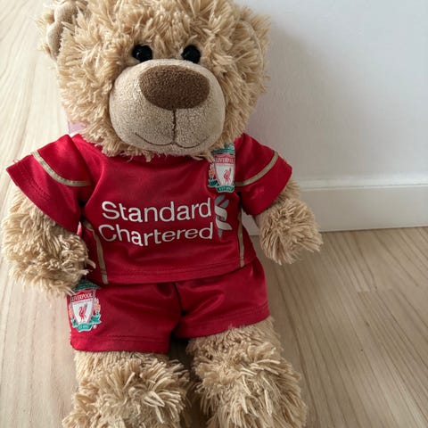 Build-A-Bear tøj sæt med fodbolddragt til bamse. Sættet omfatter flere små spilledragter inspireret af fodboldtrøjer med tilhørende shorts, strømper og små sko samt en kasket. Tøjet er designet til at passe på Build-A-Bear bamser og lignende bamser i tilsvarende størrelse. Velegnet til leg, udklædning og rollelege med bamser.