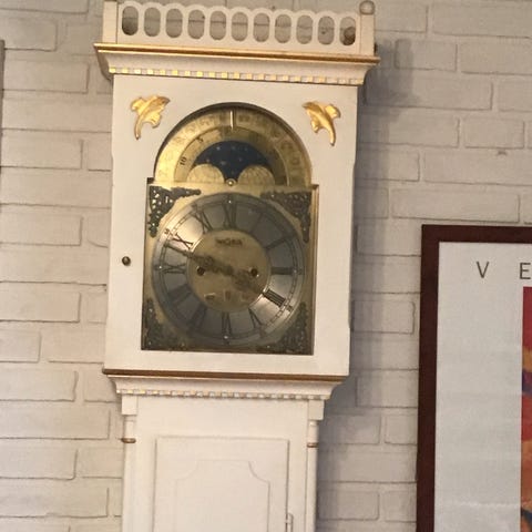 Gulvur i træ med malet overflade i hvid og gyldne detaljer. Uret har rund urskive med romertal og blå midte. Høj, slank kabinetform med frontlåge til opbevaring af urværk og lodder. Velegnet som fritstående gulvur i stue, gang eller lignende rum.