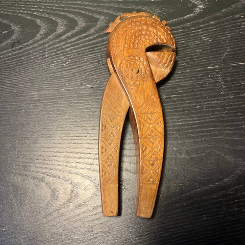 Træ nøddeknækker med udskårne geometriske mønstre. Fremstillet i massivt træ med detaljeret dekoration på håndtag og hoved. Egnet til at knække mindre nødder og kan også anvendes som dekorativt køkkenpynt