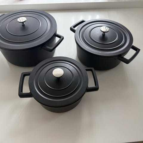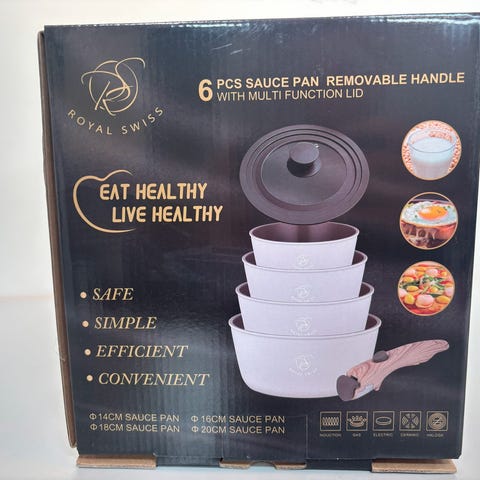 10 dele Royal Swiss grydesæt i rustfrit stål. Bestående af 2,5 l. gryde med låg, 3,4 l. gryde med låg, 4,5 l. gryde med låg, 5,8 l. gryde med låg og 7,4 l. gryde med låg. Virker også til induktion. Ubrugt og i original emballage