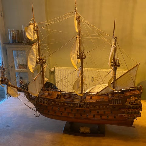 Royal Louis modelskib i træ i brun farve. Detaljeret skibsmodel med tre master, sejl og omfattende rig. Skibet står på en træfod med navneskilt. Egnet som dekoration eller samlerobjekt og kan placeres på bord, hylde eller i montre. Længden er 93 cm