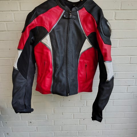 Frank Thomas motorcykeljakke i sort læder til dame/herre/unisex, størrelse EUR 38 (UK 12). Jakken har høj krave med spænde og gennemgående lynlås foran. Den har justerbare spænder i siderne/livet. Der er lynlåslommer i siderne samt en lodret brystlomme med lynlås udover en indvendig lynlåslomme. Medfølgende beskyttelsesindlæg til skuldre, albuer og ryg, som kan ses på billederne. Indersiden er foret for øget komfort under kørsel. Velegnet som motorcykeljakke med integrerbar beskyttelse.