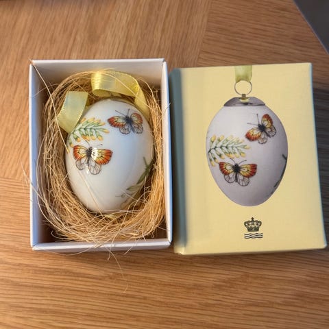 Flotte porcelæns påskeæg, den med sommerfuglene Kgl. 7,5 lang. 350 kr