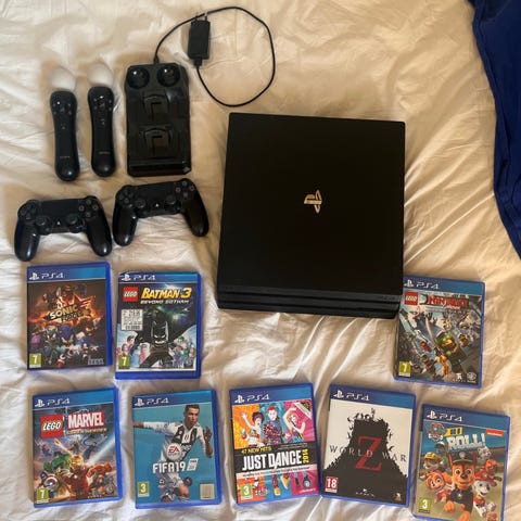 Jeg sælger dette sæt med en Playstation 4 pro og en Playstation Hyper X headset og to controller. Playstaionen er i rigtig god stand, den er ikke brugt mega meget, da jeg ventede med at sælge den, hvis nu jeg havde lyst til at bruge den. Headset er i rigtig god kvalitet samt de to controller, hvor den er i sort farve mens den anden er i blå farve. Der følger også en FIFA 22 med.