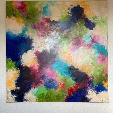 Mette Aarre - Emalje arbejde - 24x24 cm ydre mål. billedet fejler intet men rammen har fået et lille hak. Se billede. abstrakt, farverigt motiv i kvadratisk format. Billedet er signeret og dateret 2008 på bagsiden. Motivet er udført i stærke farver med blandt andet orange, gul, blå og grønne nuancer samt tekstur i overfladen. Maleriet er indrammet i en sølv træramme med synlige brugsspor. Velegnet til ophængning i stue, kontor eller andre rum, hvor der ønskes et farverigt, moderne udtryk.