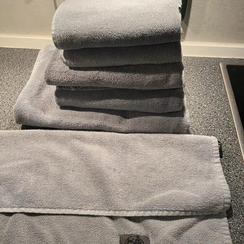 Aldrig brugt - ligger stadig i indpakning (dem på billedet er vores egne, samme håndklæder i indpakning)
